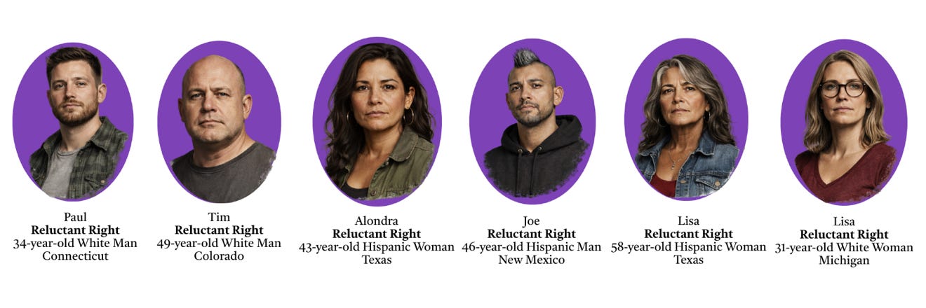 Here, we focus on the “Reluctant Right” segment. Representing a fifth of President Trump’s coalition, the Reluctant Right are his least ideological and least loyal voters. They’re also the most concerned about his immigration policy. Our six Reluctant Right Trump voters are Independents and Republicans alike, hailing from Connecticut to New Mexico. Here are our key takeaways: