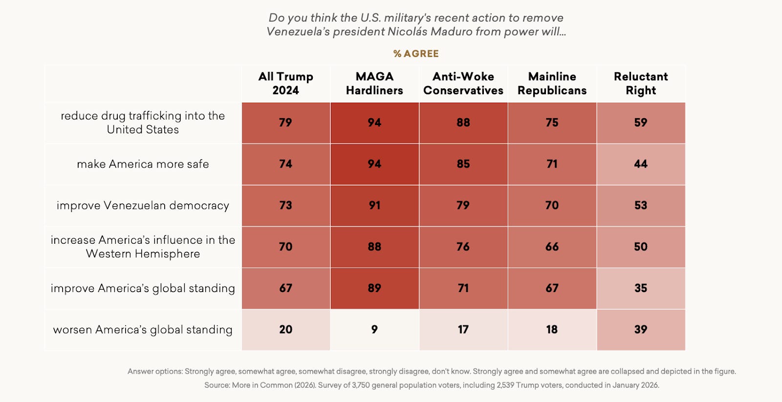 Take Venezuela as an example. Our most recent survey found that Trump voters don’t believe the U.S. military strike in Venezuela contradicts the President’s America First philosophy: less than one in ten Trump voters think that short-term U.S. control of Venezuela is “against America First” principles. Trump voters trust that Maduro’s removal from power in fact advances American interests, believing it would reduce drug trafficking into the U.S. (79 percent), make America safer (74 percent), and increase America’s influence in the Western Hemisphere (70 percent).