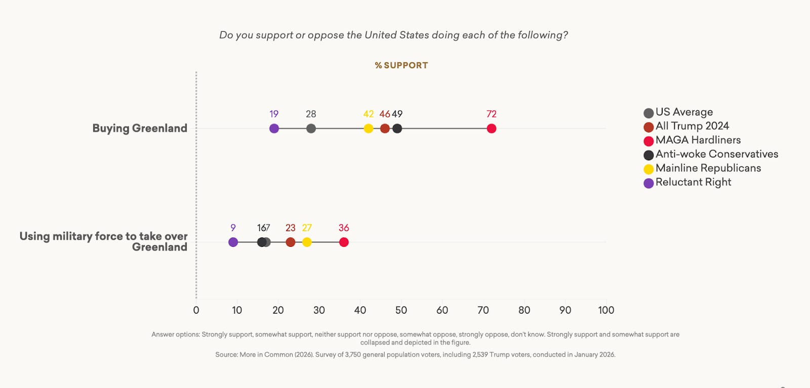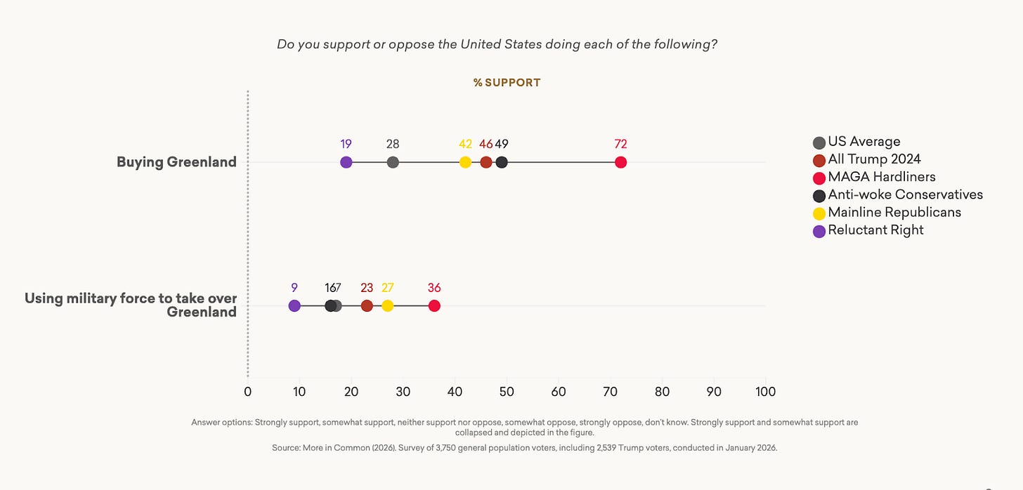 When it comes to Greenland, the case is not yet closed to Trump voters on whether taking over the territory advances American interests and aligns with America First. MAGA Hardliners are overwhelmingly supportive of buying Greenland (75 percent), but Mainline Republicans are less enthusiastic (42 percent) and the Reluctant Right are skeptical (19 percent). The Trump coalition is even less enthusiastic about using military force to capture Greenland: less than one in four Trump voters are supportive. Evidently, the question of whether the pursuit of Greenland benefits or harms American interests was not decisive enough for President Trump to continue.